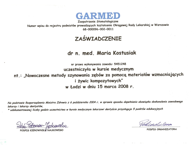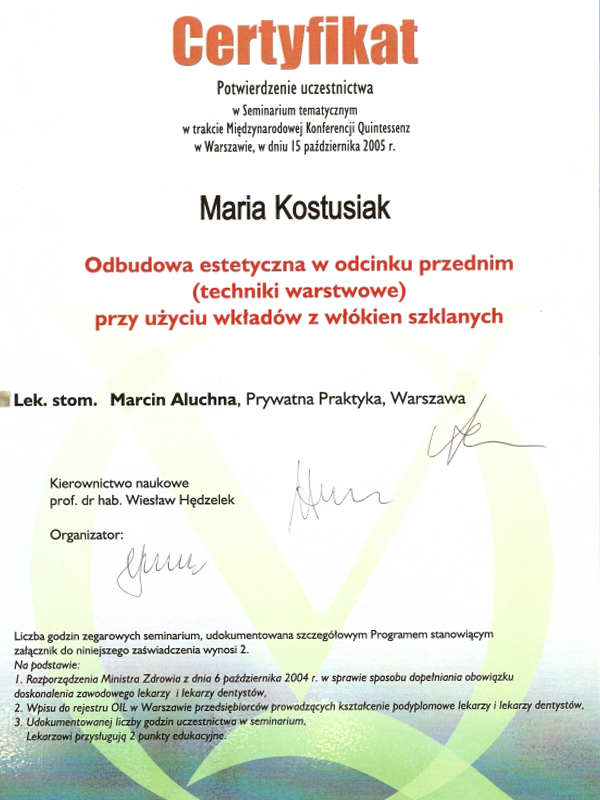 Odbudowa estetyczna w odcinku przednim przy użyciu włókien szklanych – Warszawa 2005
